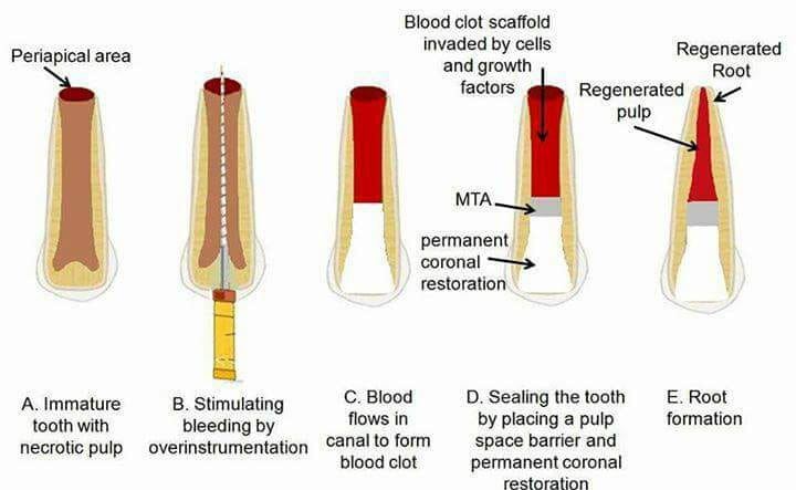 Teeth with necrotic pulp and open apexes are conventionally being treated with ‘apexification’ using calcium hydroxide to induce apical hard tissue barrier formation or MTA plug to shorten the treatment time and avoid the vulnerability of coronal restoration’s re-infection. However both techniques fail to promote vitality restoration or root maturation. Clinical researches have shown that biologically based procedures eliminate clinical symptoms of apical periodontitis, thicken canal walls and lead to apical closure in permanent immature teeth with necrotic pulp. There are two possible strategies: ‘cell transplantation’ and ‘cell homing’.